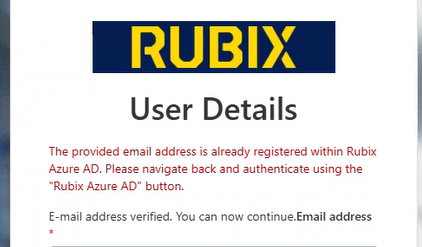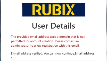 Similar restrictions have been added to Rubix internal accounts to ensure SSO is used and Entra validation is used. Rubix users trying to sign up to B2C using their Rubix email will now receive the below message: